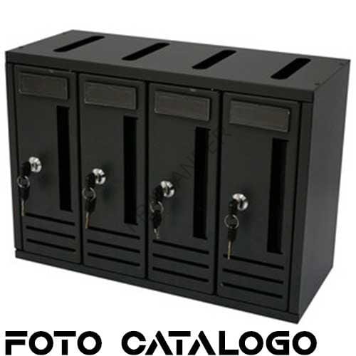 Cassetta postale per condomini in metallo color Antracite da 4 posti. Possibilità di inserire la posta sia frontale, dallo sportello, che dalla parte superiore, grazie alla fessura presente sul tetto.  Ogni cilindro ha 2 chiavi in dotazione.  Dimensioni cm 42x18x30h.