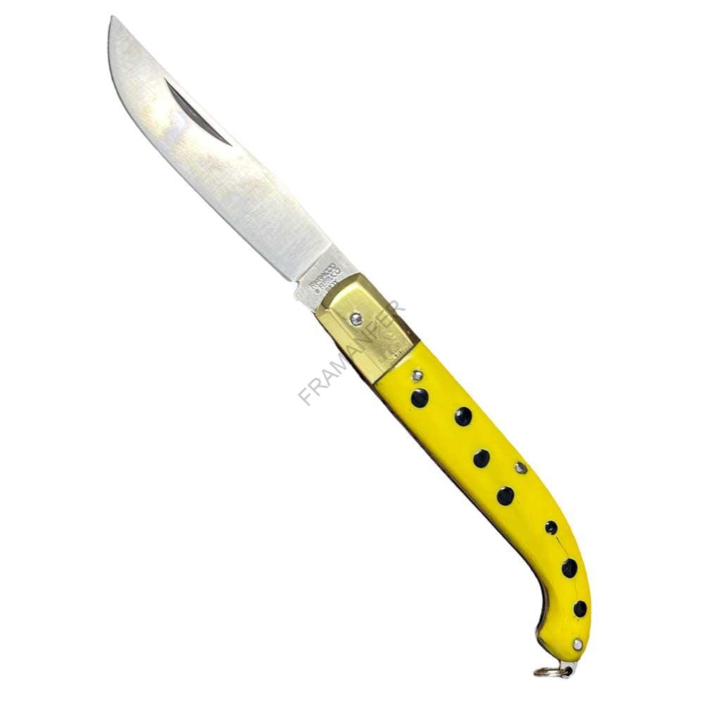 Coltello a serramanico modello zuavo da 19cm. Modello con manico in plastica gialla con puntini neri, effetto tartarugato tipico di Frosolone. Lama in acciaio inox.