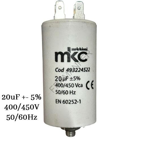 Condensatore 20uF microfarad – ± 5% – 400/450V ac – 50/60Hz – in polipropilene avente terminali a faston da 6,3mm doppi per ogni polo. Avente dimensioni: 40*73mm (misure della cassa in polipropilene, quindi misure escluse di faston e vite). Impiego per marcia ed avviamento motori. Con vite da 8AM corredata di rondella dentellata e dado.
