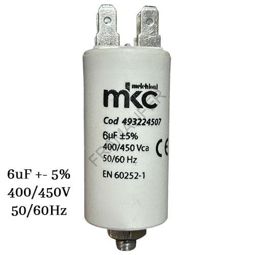 Condensatore 6uF microfarad – ± 5% – 400/450V ac – 50/60Hz – in polipropilene avente terminali a faston da 6,3mm doppi per ogni polo. Avente dimensioni: 30*60mm (misure della cassa in polipropilene, quindi misure escluse di faston e vite). Impiego per marcia ed avviamento motori. Con vite da 8AM corredata di rondella dentellata e dado.