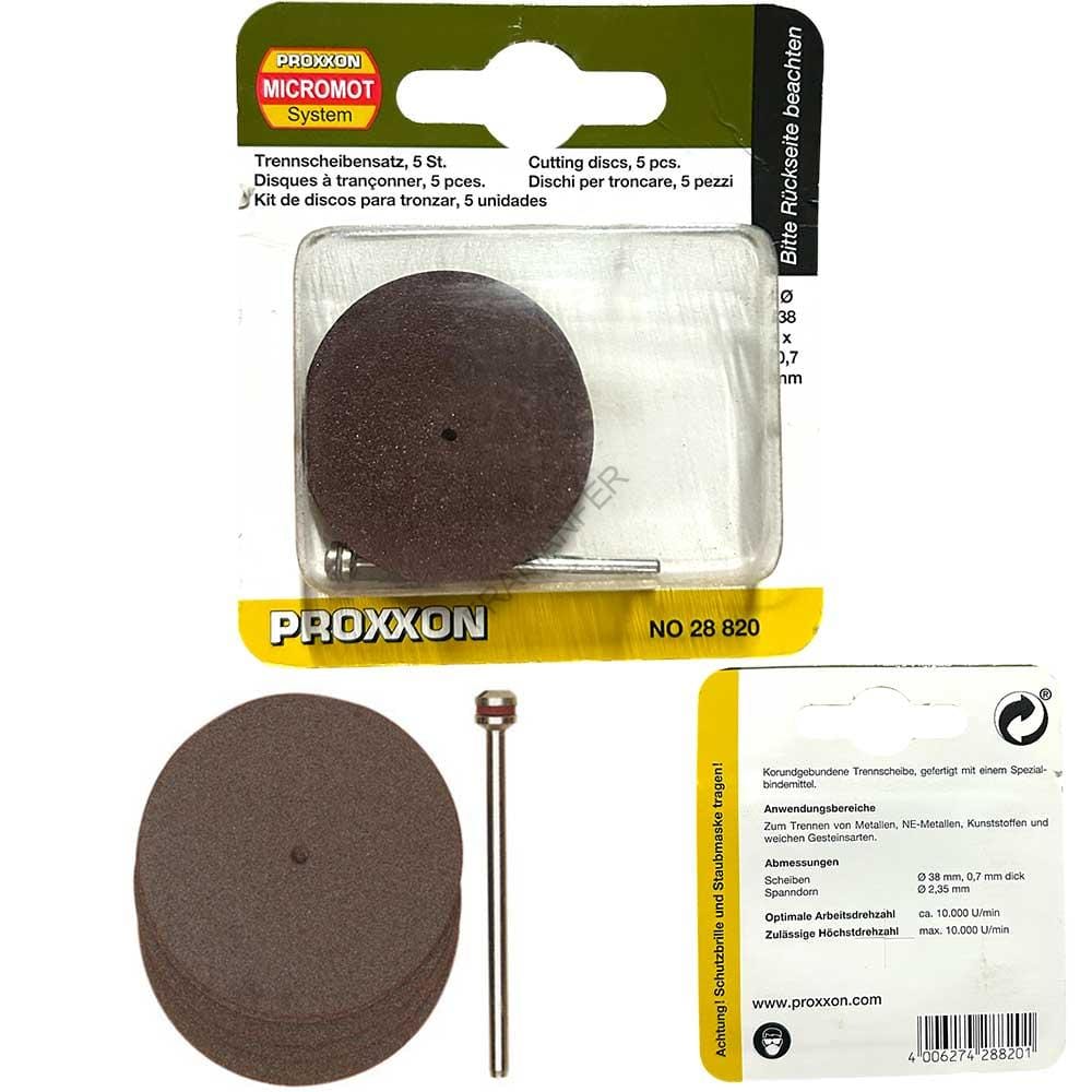 Mole troncatrici in confezione da 5pz con albero porta mole della Proxxon N° 28820. Mole avente diametro  Ø38mm e spessore 0,7mm. Albero avente Ø2,35mm e lunghezza 44mm. Da utilizzare a massimo 10.000rpm. Mole al corindone. Per troncare acciaio, metalli non ferrosi, materie plastiche e legno.