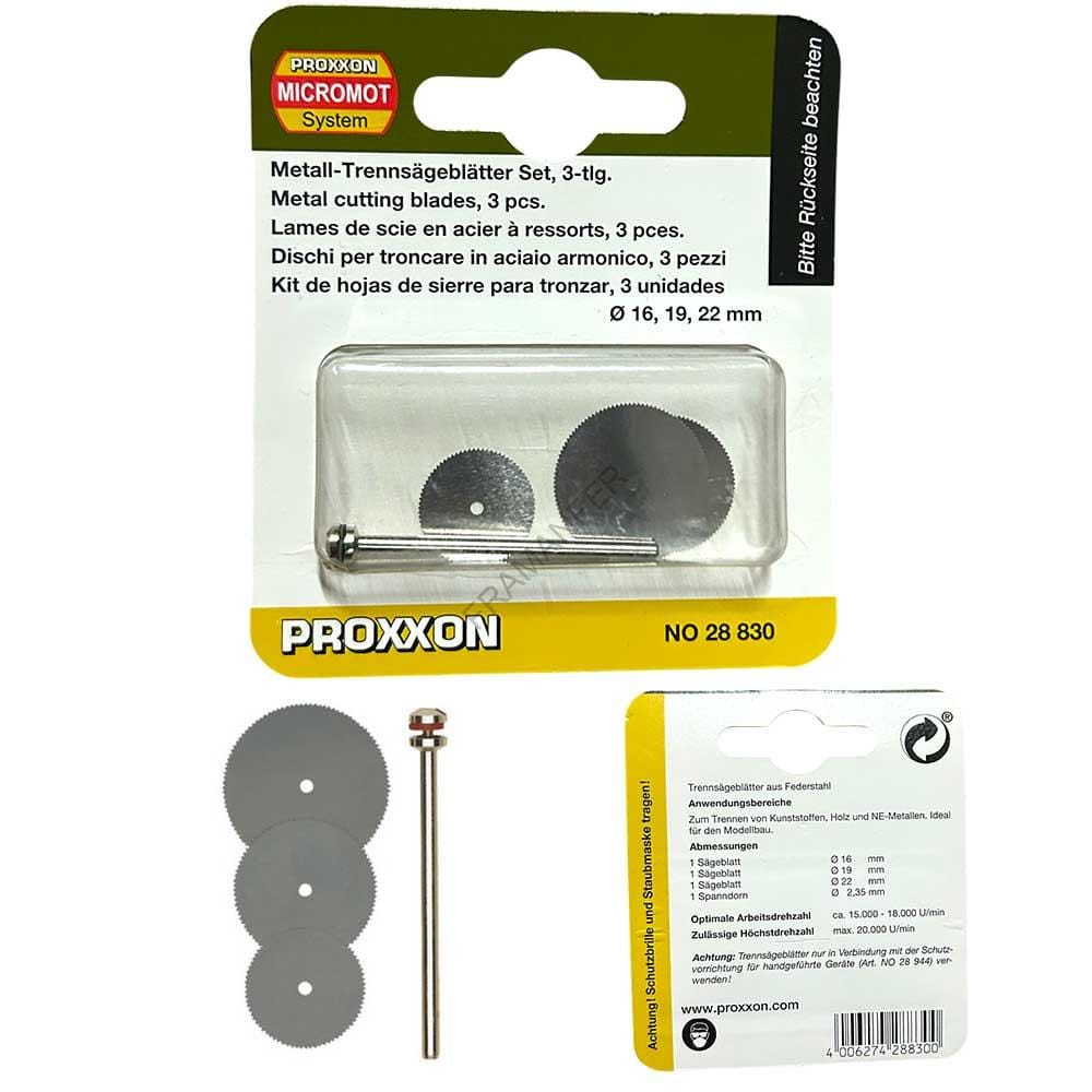 Dischi in acciaio HSS. Per materie plastiche, legno e metalli non ferrosi. 3 dischi  da Ø16 – Ø19 – Ø22 mm Spessore 0,1 mm. Gambo da Ø2,35mm della Proxxon N° 28830.