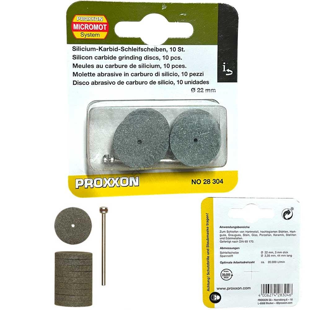 Disco al carburo di silicio abrasivo in confezione da 10pz con albero porta mole della Proxxon N° 28304.  Disco avente diametro  Ø22mm e spessore 3mm. Albero avente Ø2,35mm e lunghezza 44mm. Da utilizzare a massimo 20.000rpm. DISCHI ABRASIVI in carburo di silicio. Per affilare e smerigliare metalli e i materiali più svariati.