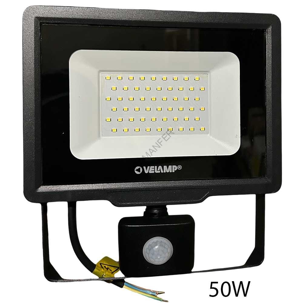 Faro con sensore di movimento a led da 50w della Velamp. La distanza di rilevamento, l’angolo, il tempo e l’illuminazione possono essere impostati e regolati manualmente. Non dimmerabile.  Avente le seguenti caratteristiche: