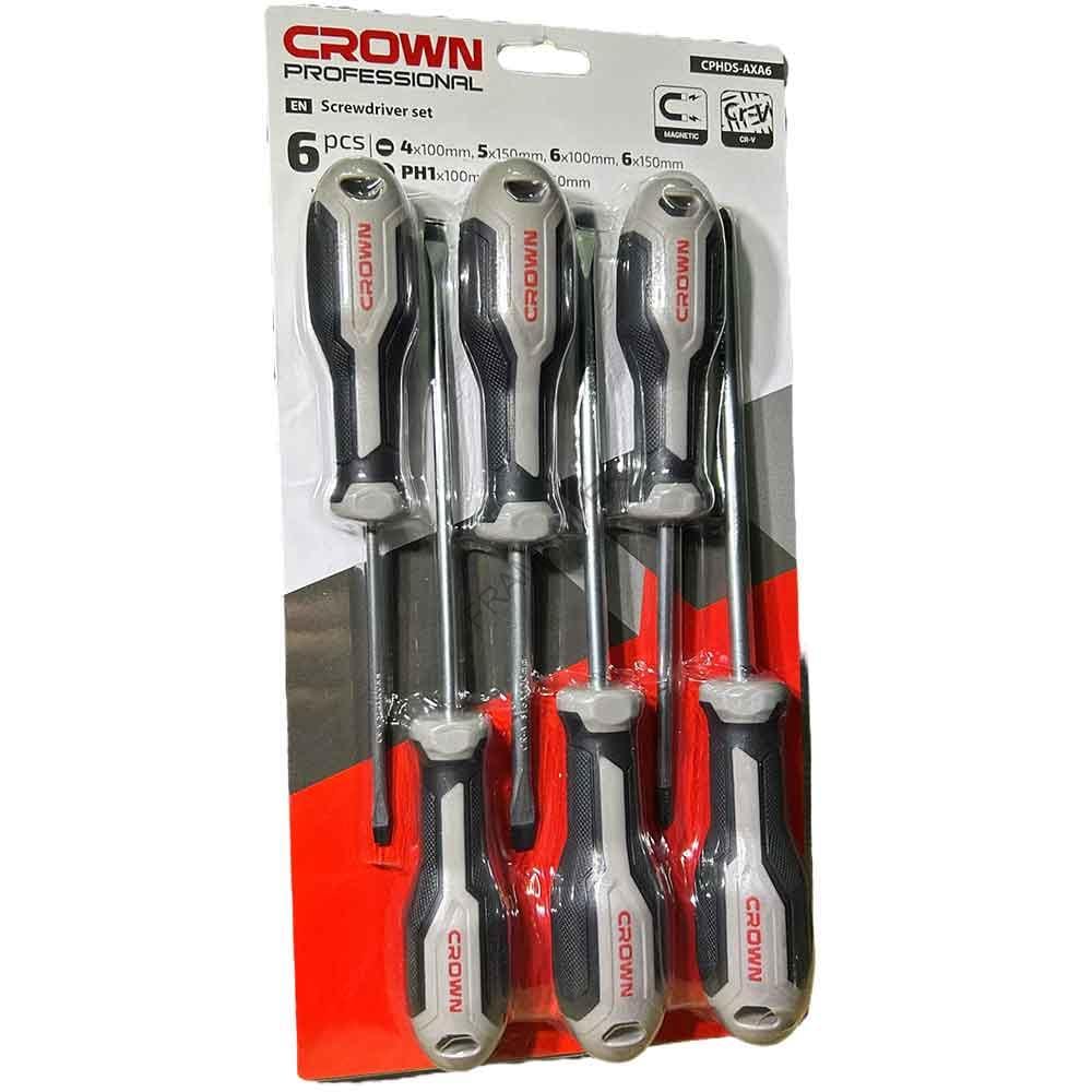 Crown kit da 6 pezzi cacciaviti assortiti: Taglio 4×100, 5×150, 6×100, 6×150. Croce: ph1x100, ph2x150. L’impronta PH permette di avvitare e svitare agevolmente sia viti per metallo che per legno.