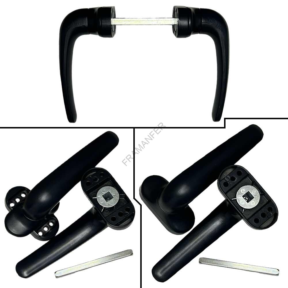 Maniglia universale quadro 8mm realizzata in alluminio verniciato Nero. In dotazione 2 maniglie ( 1 coppia), quadro 8mm, viti per il fissaggio su metallo. Ogni maniglia è universale in quanto si può installare su porte destre che sinistre in quanto la molla interna agisce in entrambi i versi. Nella parte superiore della sezione ovale, ruotando il coperchio, sono presenti 6 fori ( 3 inferiori e superiori ) per il fissaggio della stessa. Attenzione: Non è necessario usarli tutti e 6 in quanto è un sistema ideato per renderla compatibile con quanti più modelli possibili.