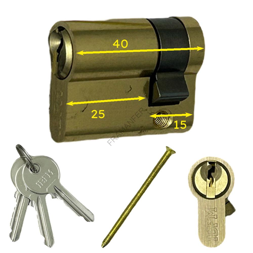 Mezzo cilindro sagomato ottone 40mm con nottolino centrale DIN. Totale misura 40mm, diviso misura: dall’inizio alla camma sono 25mm – camma 10mm – chiusura 5mm. In foto è tutto illustrato.