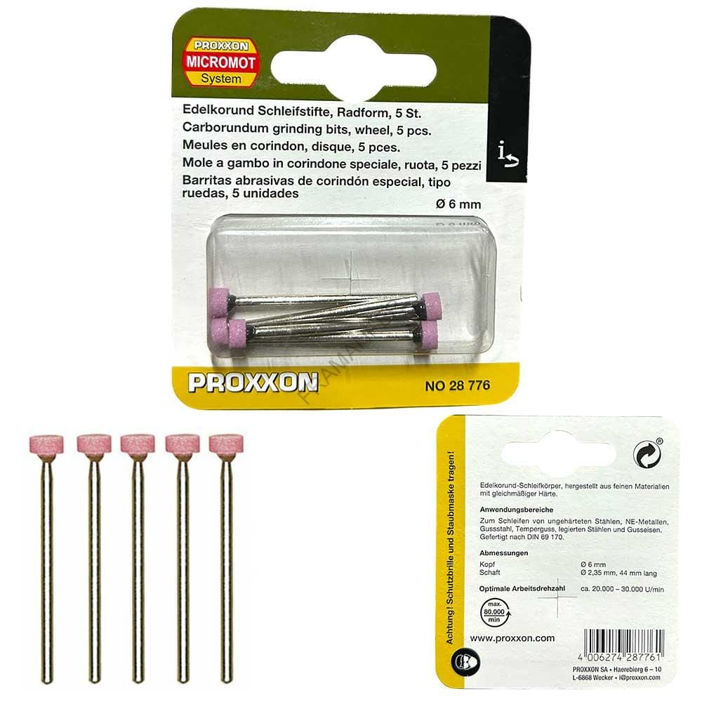 Mola al corindone speciale a forma di disco con gambo da Ø2,35mm in confezione da 5pz della Proxxon N° 28776.  Mole avente Ø6mm. Velocità massima: 80.000 rpm. Range ideale di utilizzo: 20.000–30.000 rpm.  Per smerigliare e cesellare ghisa, acciai legati e nobilitati.