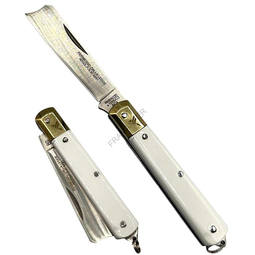 Mozzetta in abs bianca con lama da 15cm in acciaio inox della Fenix e collarino in ottone lucido. Con pratico anello finale per fissare cordino o portachiavi (non inclusi).