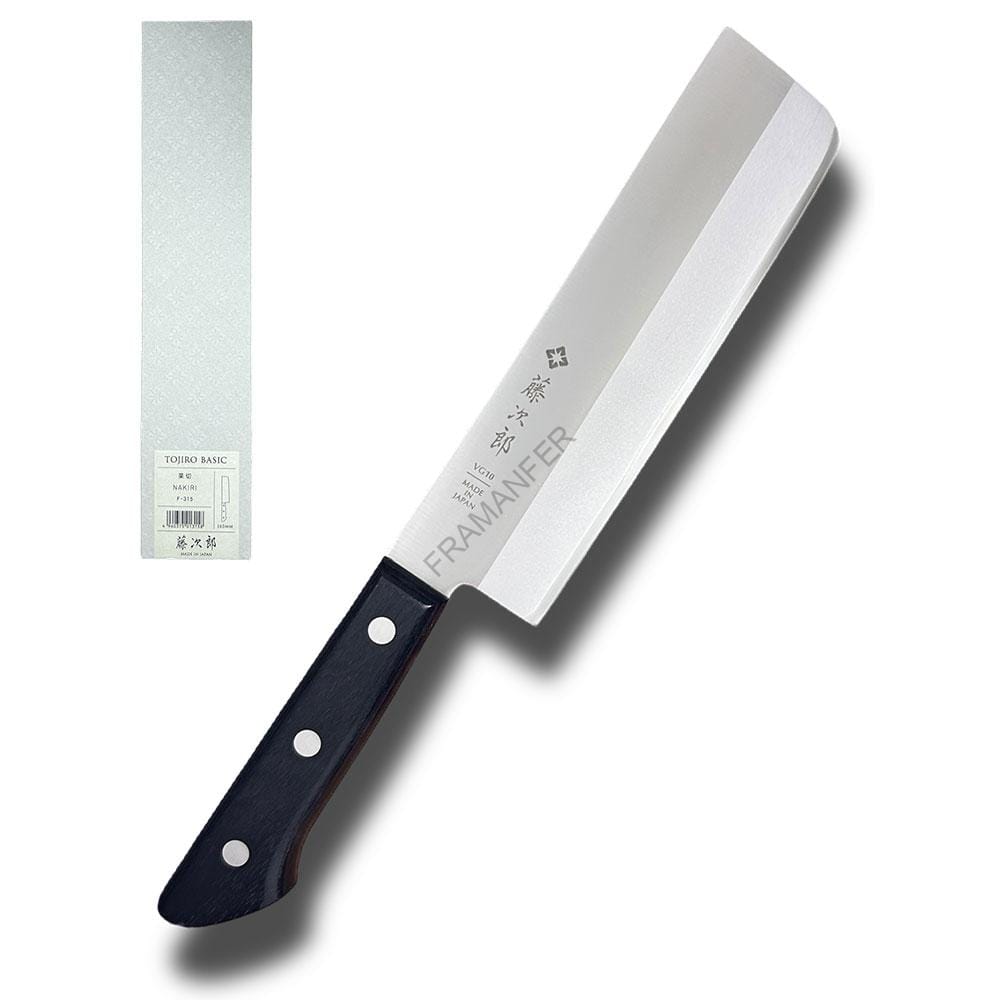 Coltello Giapponese Nakiri Tojiro da 165mm (solo lama) realizzato in acciaio inox VG10 con durezza 60-61HRC. Realizzato in Damasco 3 strati SanMai. La lama ha un semplice aspetto Migaki, con la presenza dell’effetto Kasumi tra l’incontro dei due acciai.  Manico in Pakkawood. Coltello MADE IN JAPAN.