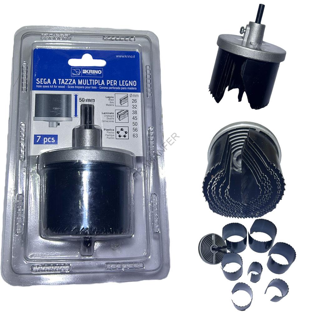 Kit di seghe a tazza per legno con lame intercambiabili in acciaio. Per la foratura nel legno, nei suoi derivati e nel cartongesso. Composto da 7 pezzi, diametri Mm. 26-32-38-45-50-56-63, altezza Mm. 50.