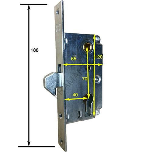 Serratura AGB entrata a 40mm a gancio con predisposizione per cilindro sagomato (non incluso). Foto reale della serratura.