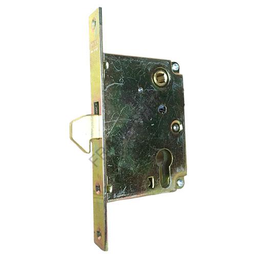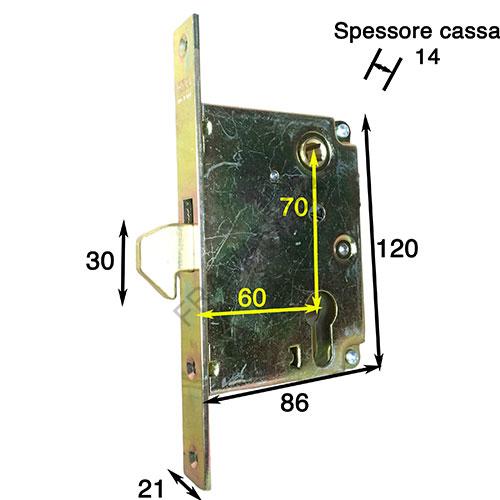 Serratura della AGB  a gancio entrata a 60mm con predisposizione per cilindro sagomato (non incluso). Foto reale della serratura.