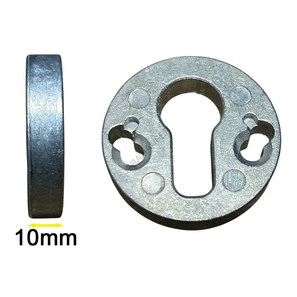 Piastrina per spessore defender spessa 10mm diametro 50 interasse 38 e 31mm. Utilizzata per recuperare lo spazio tra il defender e la serratura.