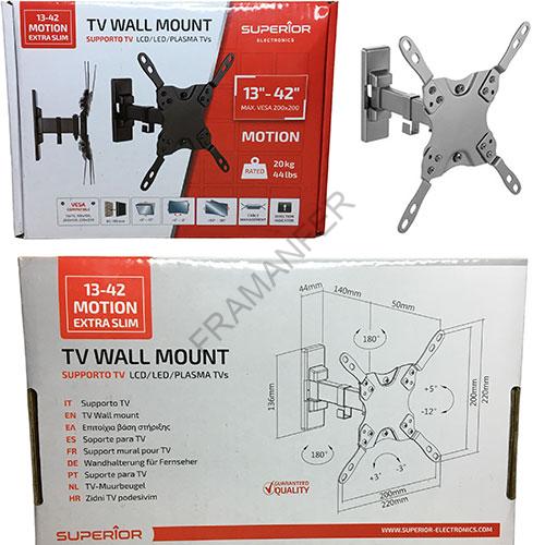 Supporto a braccio per tv da 13″ a 42″. Installazione a parete con un’aggiuntiva inclinazione di 5° / – 12° Colore nero e portata massima 20KG.